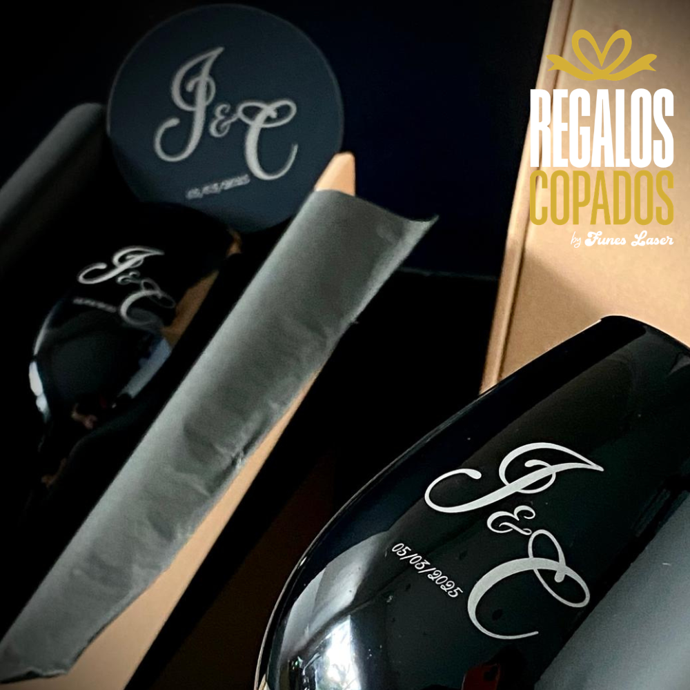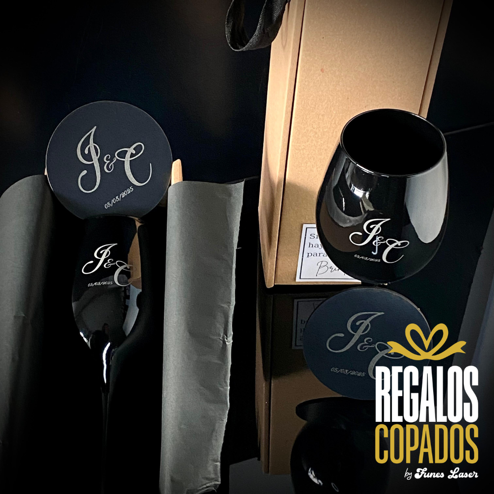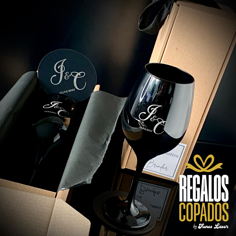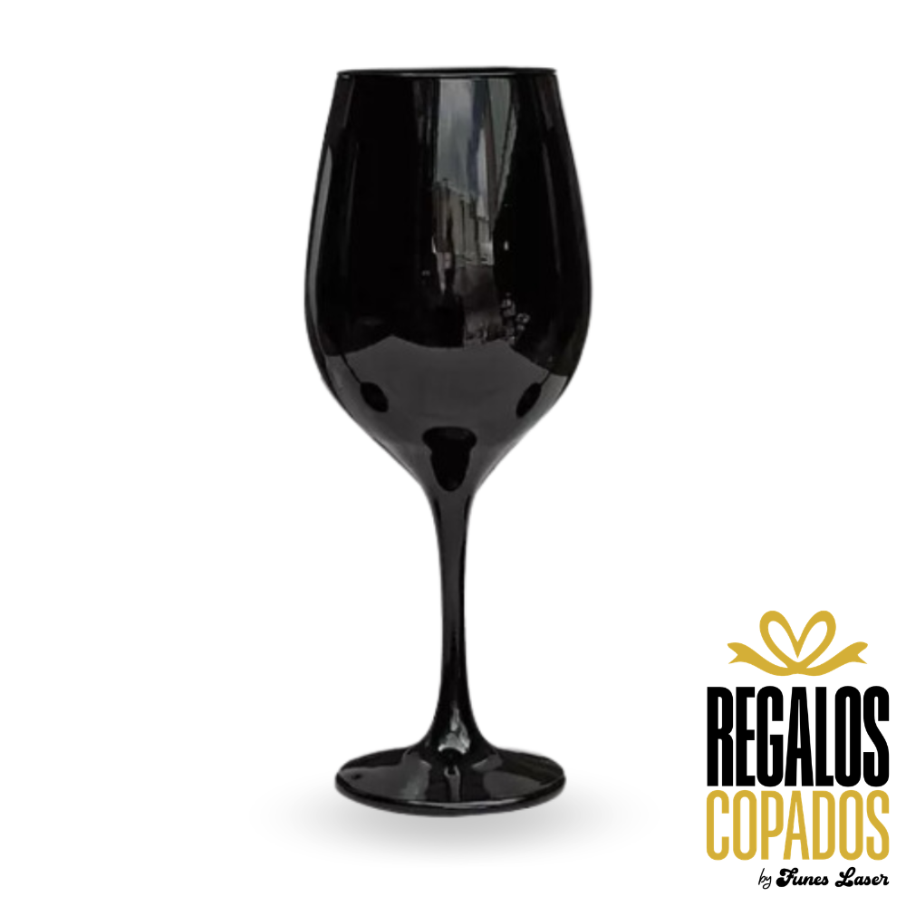 Box 🍷 copa de vino de vidrio negra ⚫ personalizada con grabado láser.