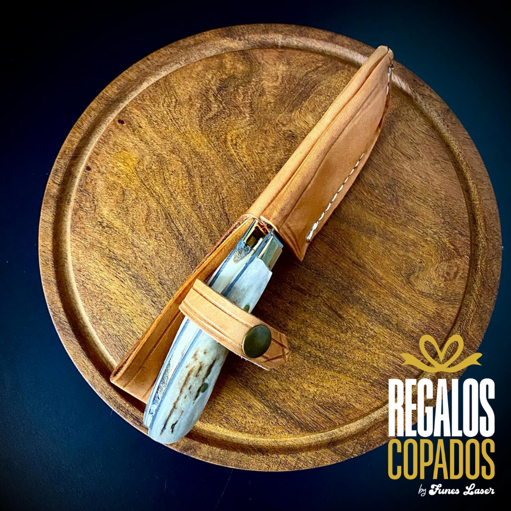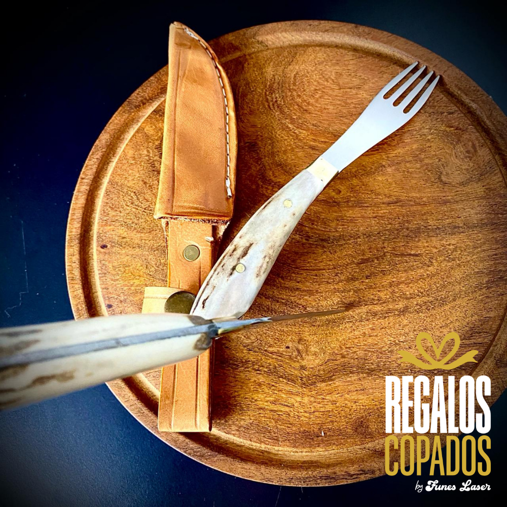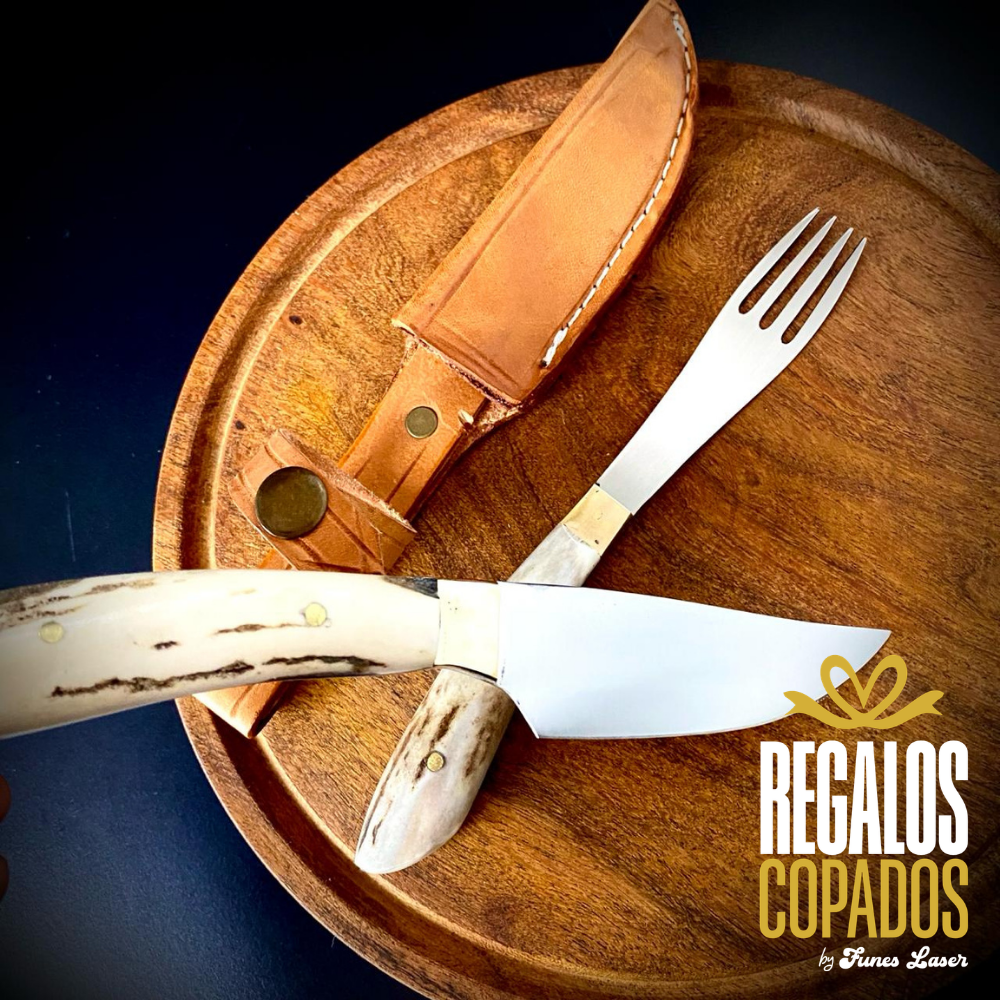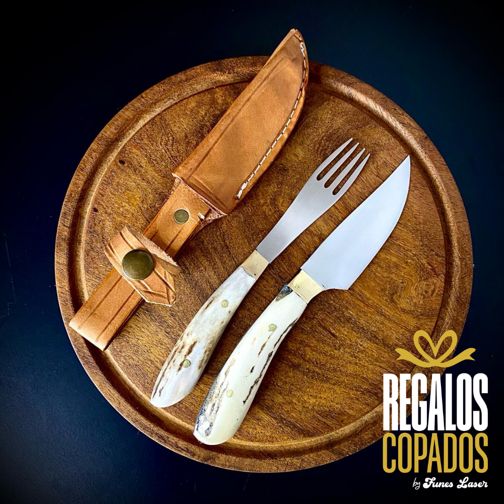 Juego de tenedor y cuchillo artesanal con hoja acero inoxidable personalizado con grabado láser de fibra óptica en una cara, no se borra, con vaina de cuero de incluída. (Uso exclusivamente culinario)