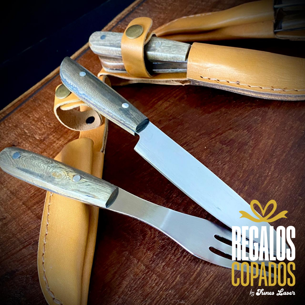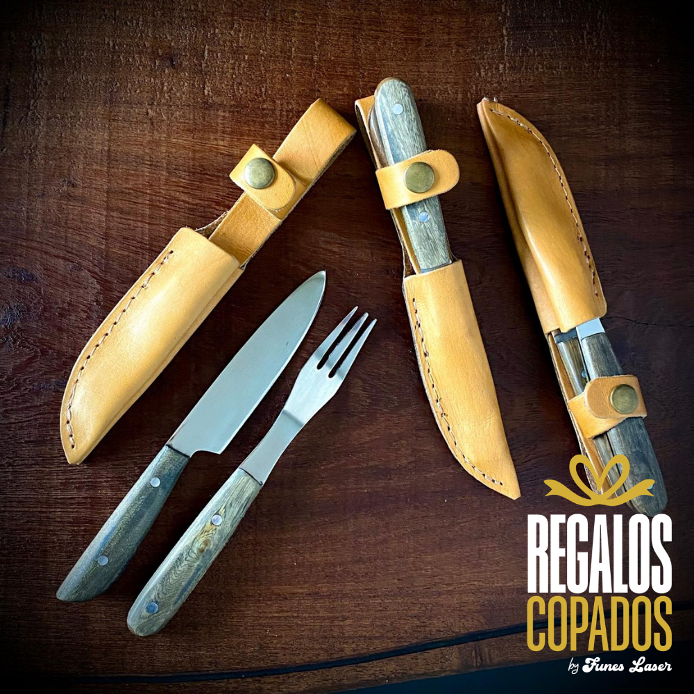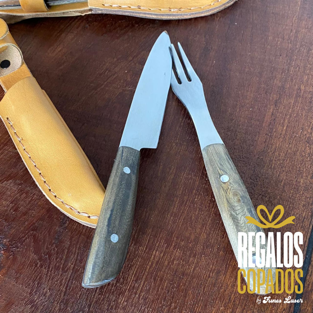 Juego de Cuchillo y tenedor de 3 puntas artesanal de acero inoxidable personalizado con grabado láser de fibra óptica en una cara, no se borra, con vaina/estuche de cuero de regalo. (Uso exclusivamente culinario)