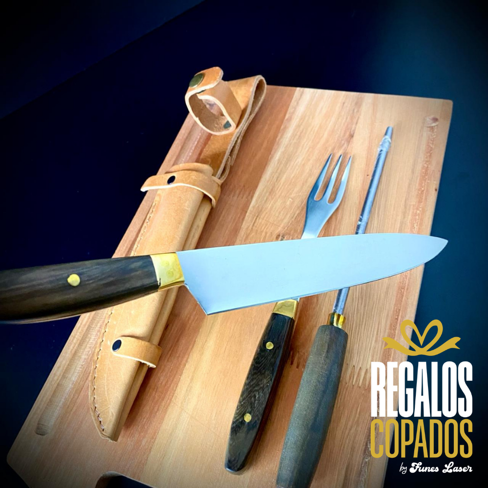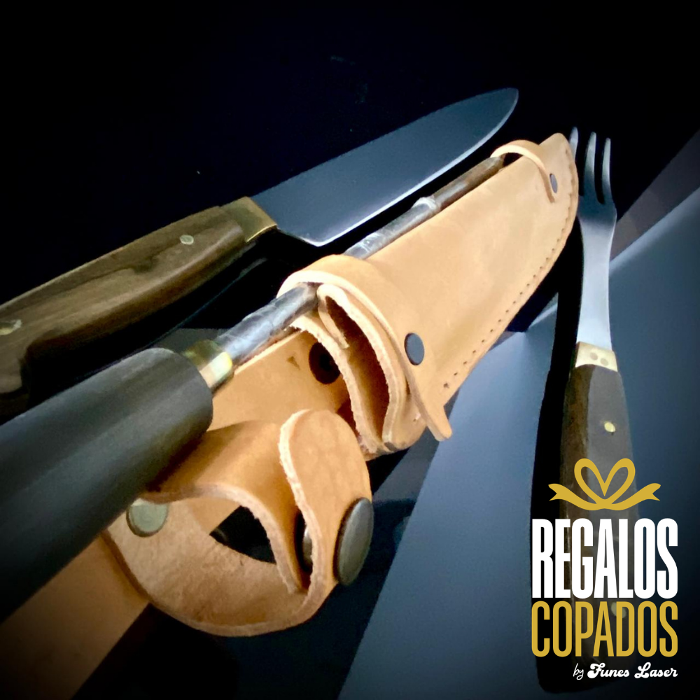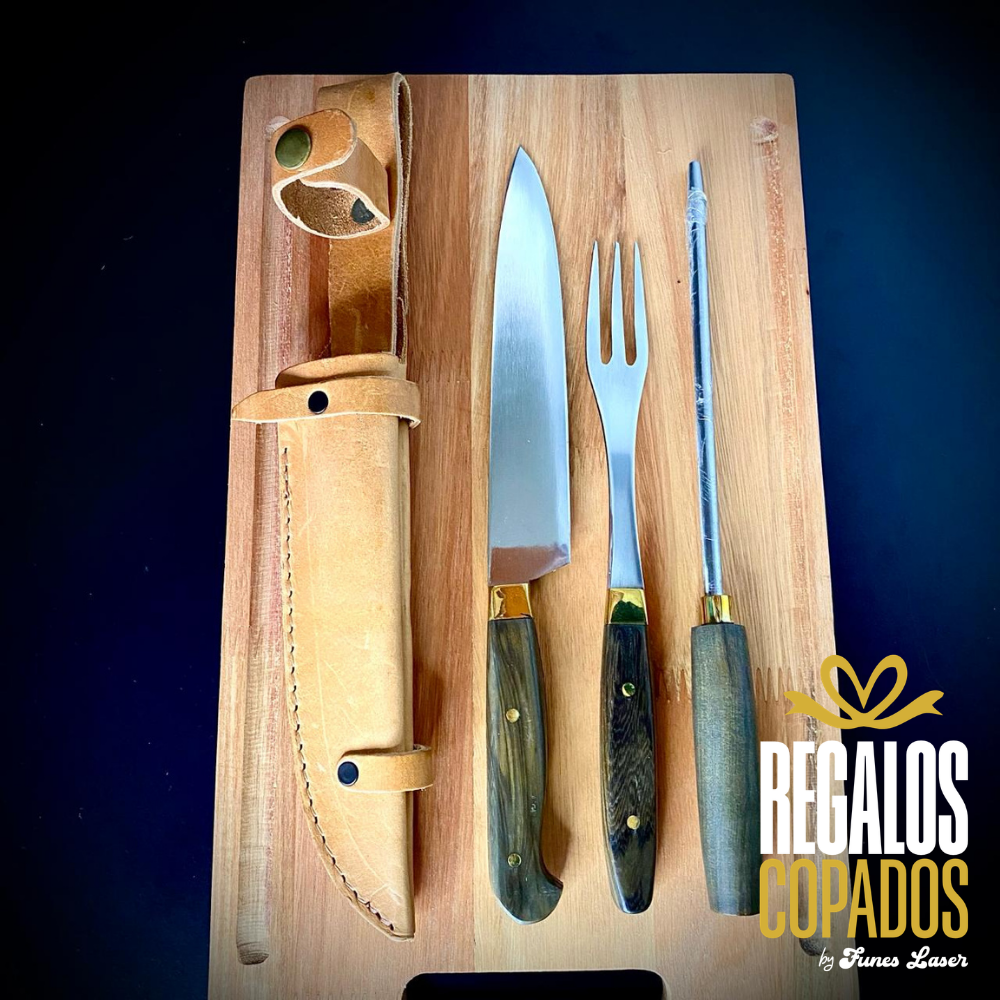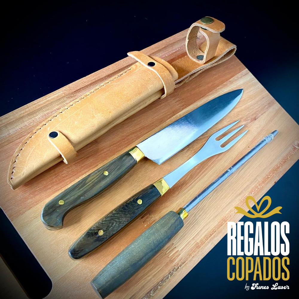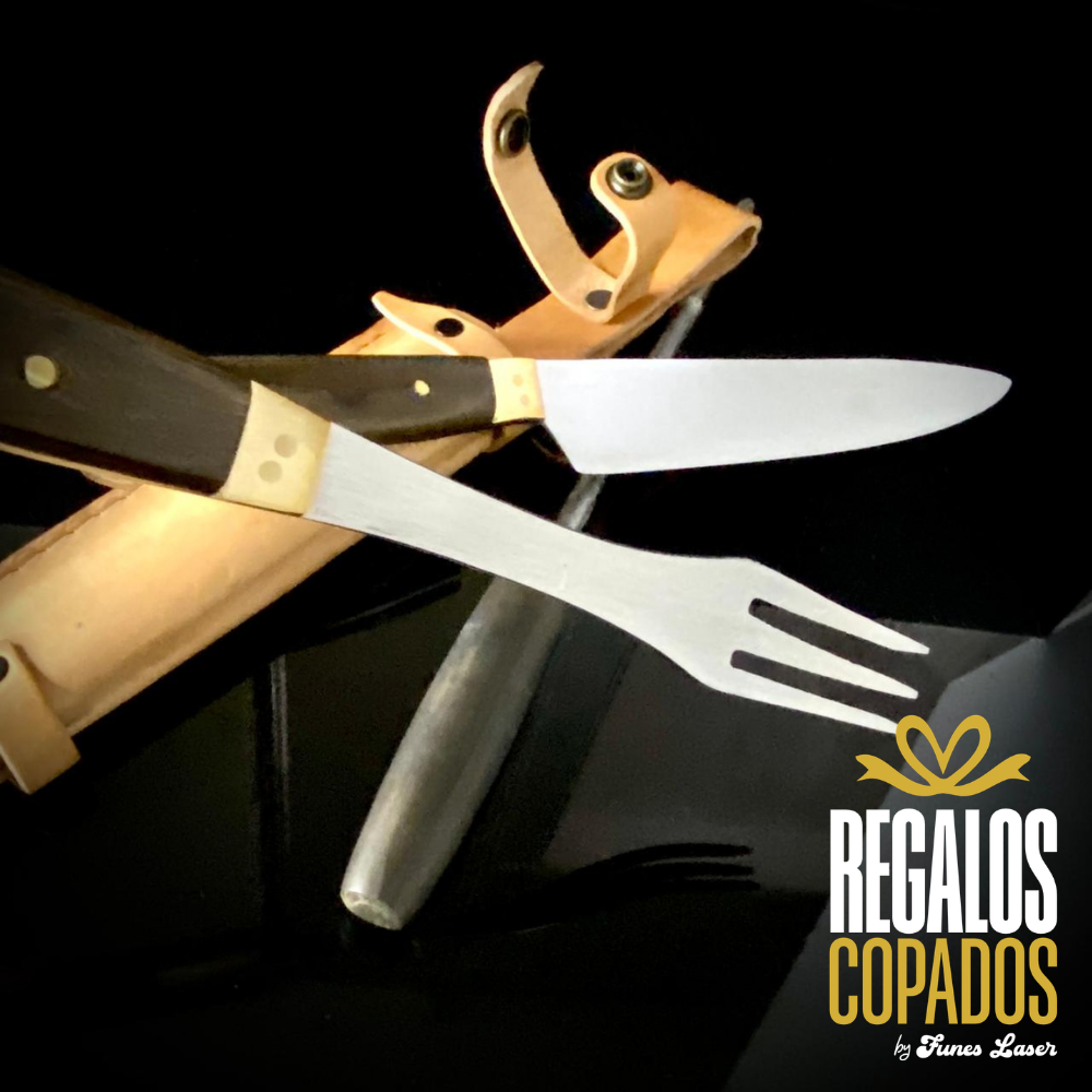 Juego de cuchillo y tenedor con mango de madera artesanal de acero inoxidable personalizado con grabado láser de fibra óptica en una cara, no se borra, incluye vaina de cuero vacuno. (Uso exclusivamente culinario)
