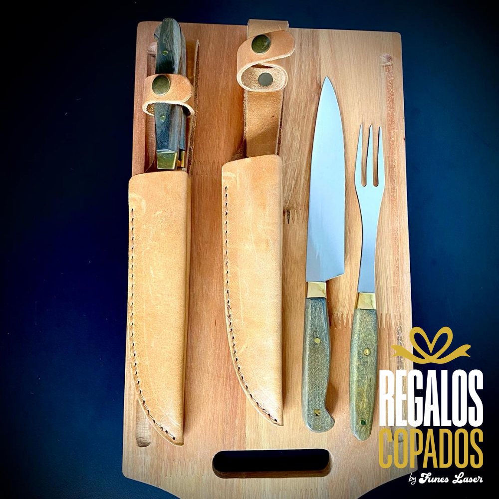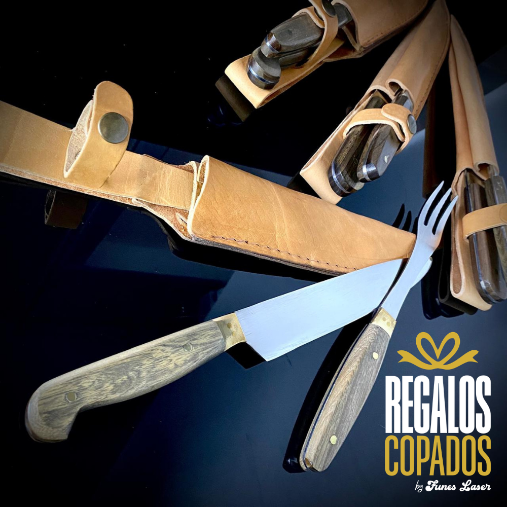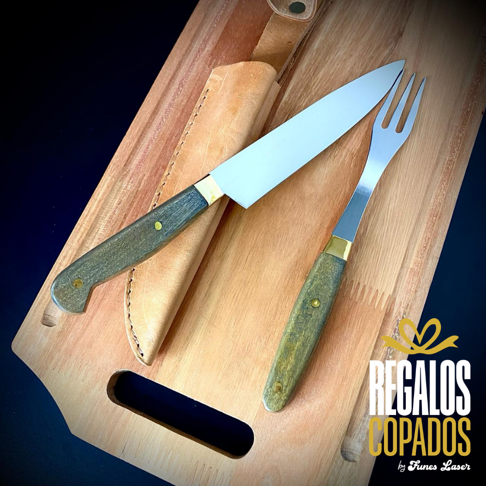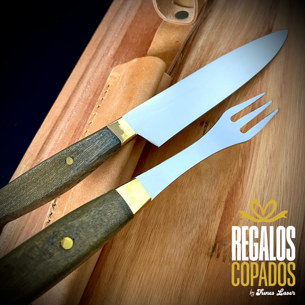 Juego de cuchillo y tenedor con mango de madera artesanal de acero inoxidable personalizado con grabado láser de fibra óptica en una cara, no se borra, incluye vaina de cuero vacuno. (Uso exclusivamente culinario)