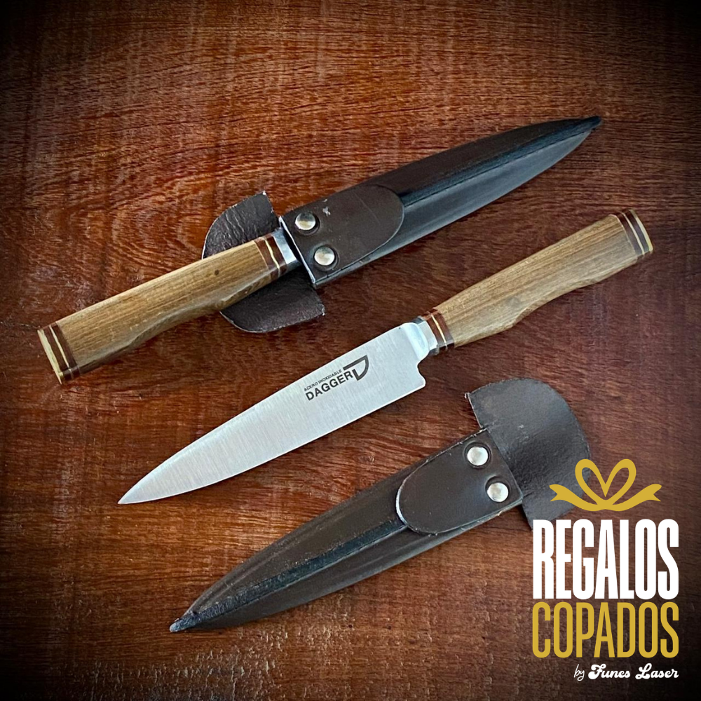 Cuchillo con cabo de madera con agarre anatómico y detalles en bronce con hoja de acero inoxidable 14 cm - 420 marca Dagger.