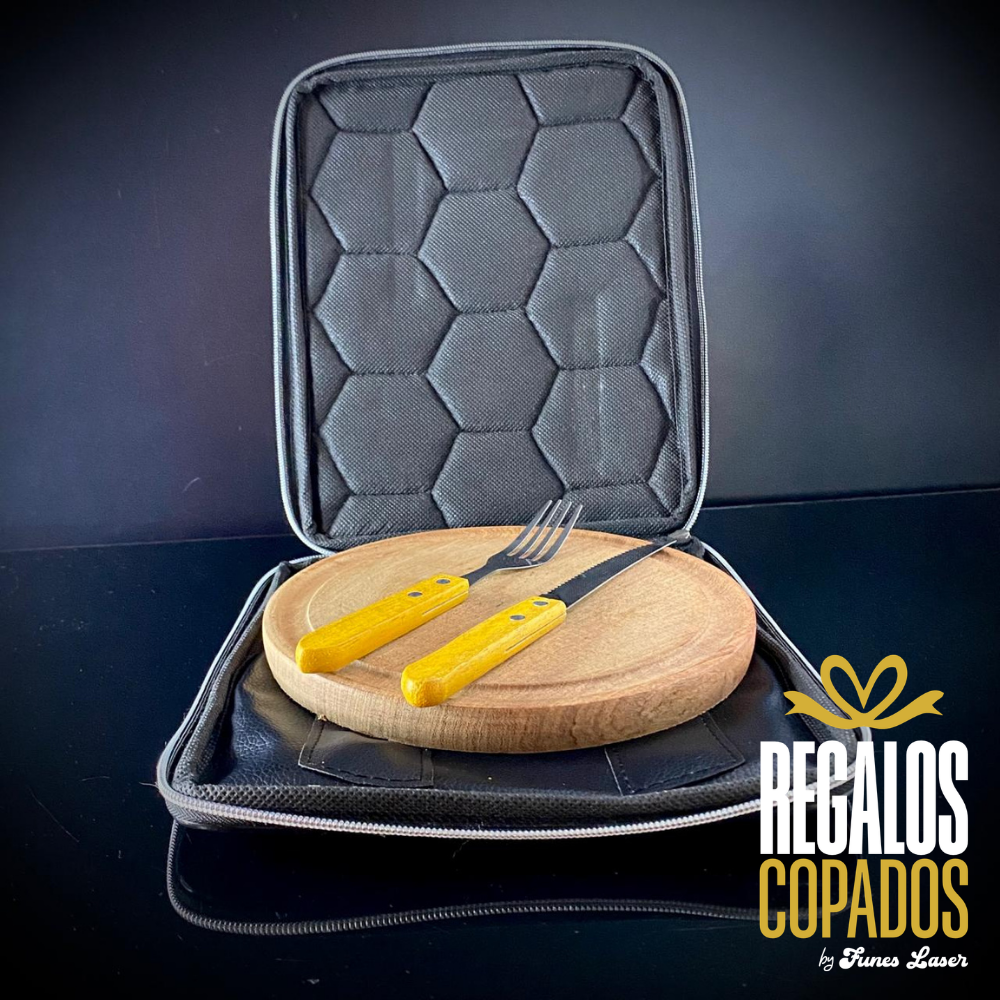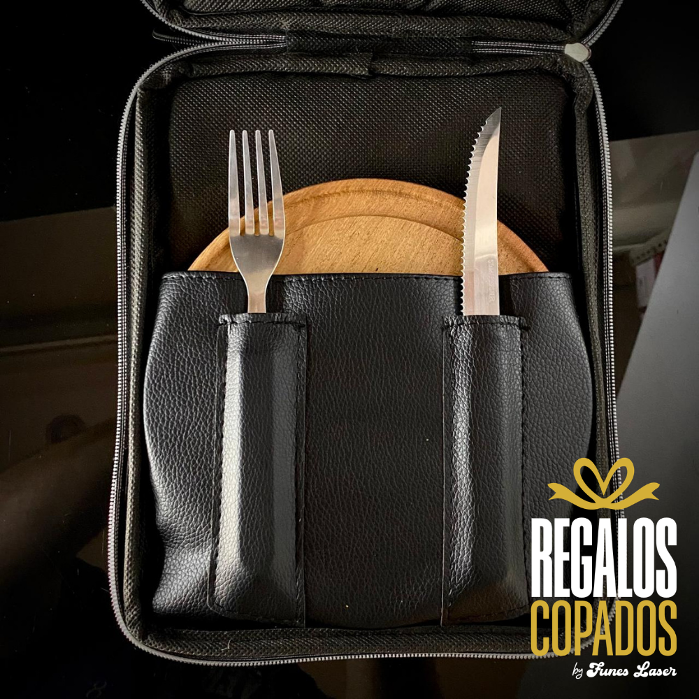 Juego cuchillo y tenedor de acero inoxidable personalizado con grabado láser de fibra óptica en una cara, no se borra. (Uso exclusivamente culinario)