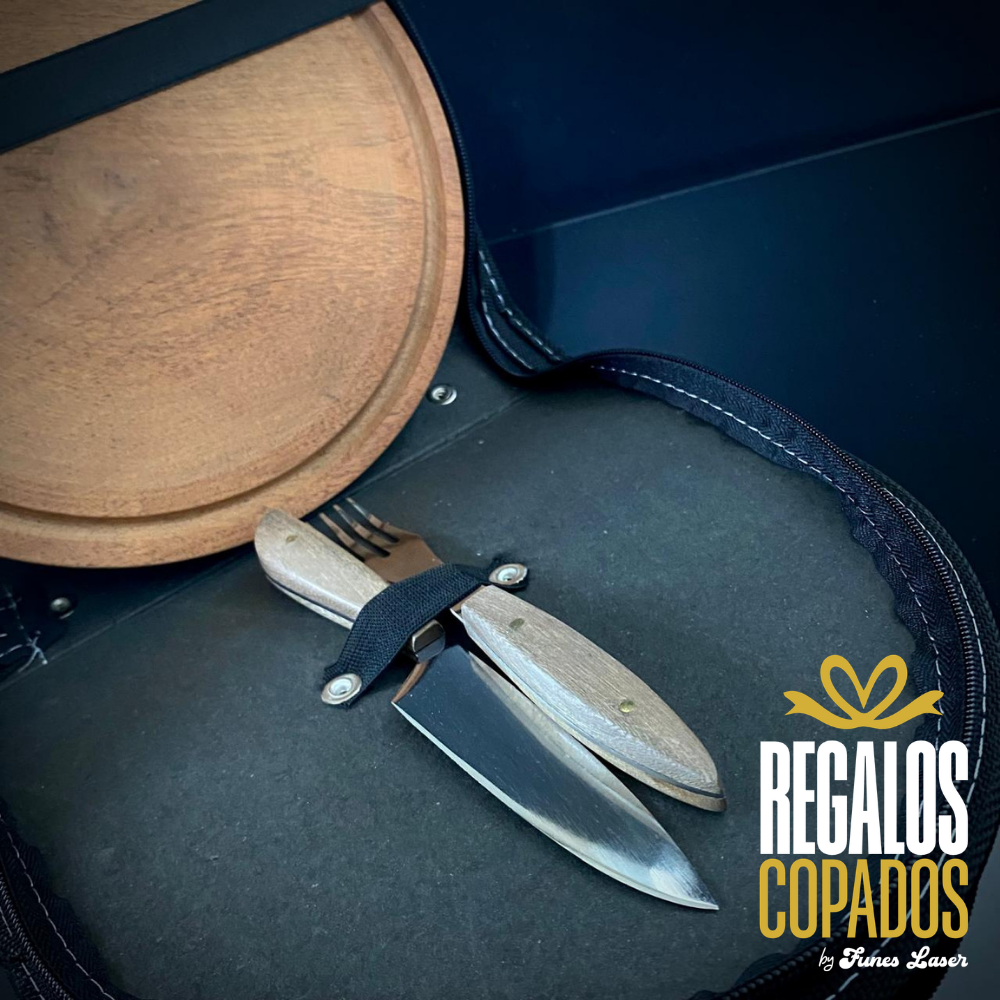 Juego cuchillo y tenedor de acero inoxidable personalizado con grabado láser de fibra óptica en una cara, no se borra. (Uso exclusivamente culinario)
