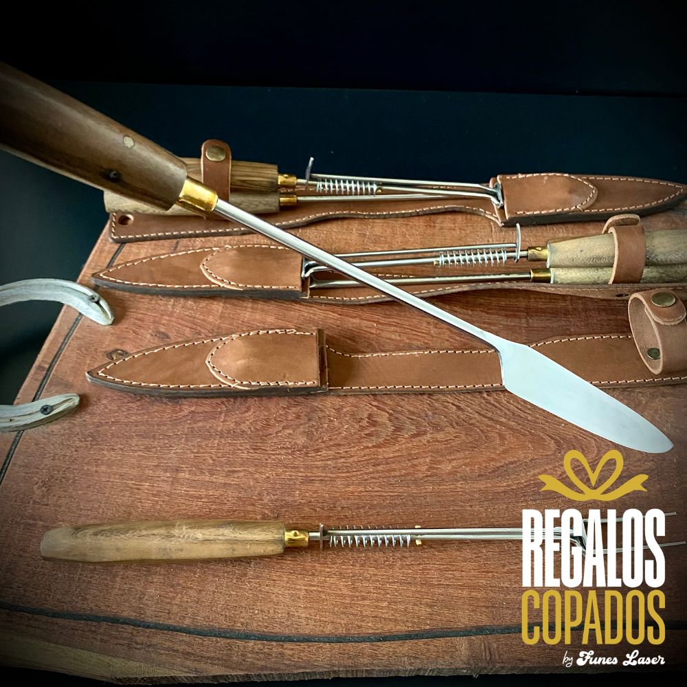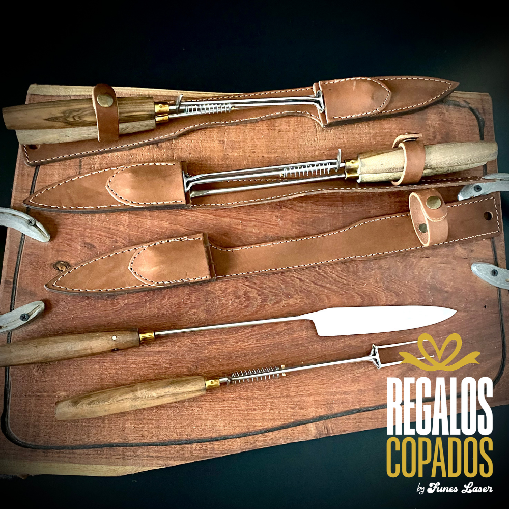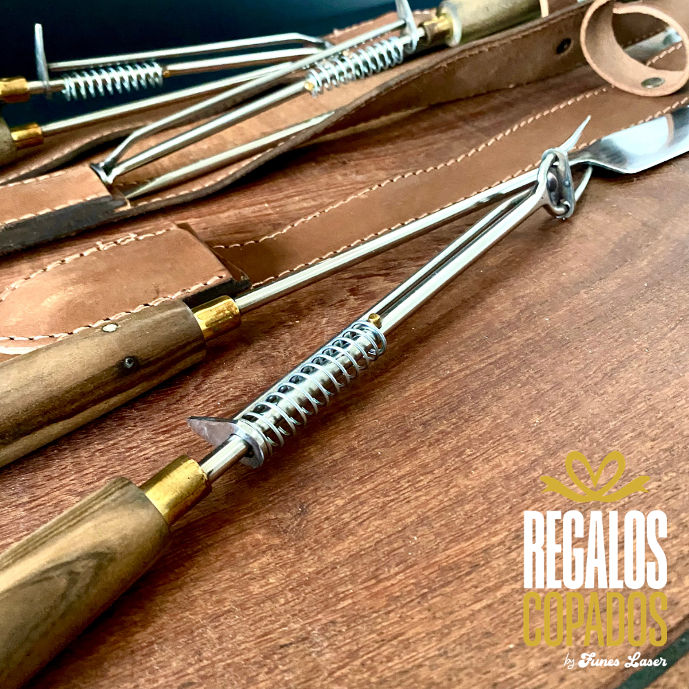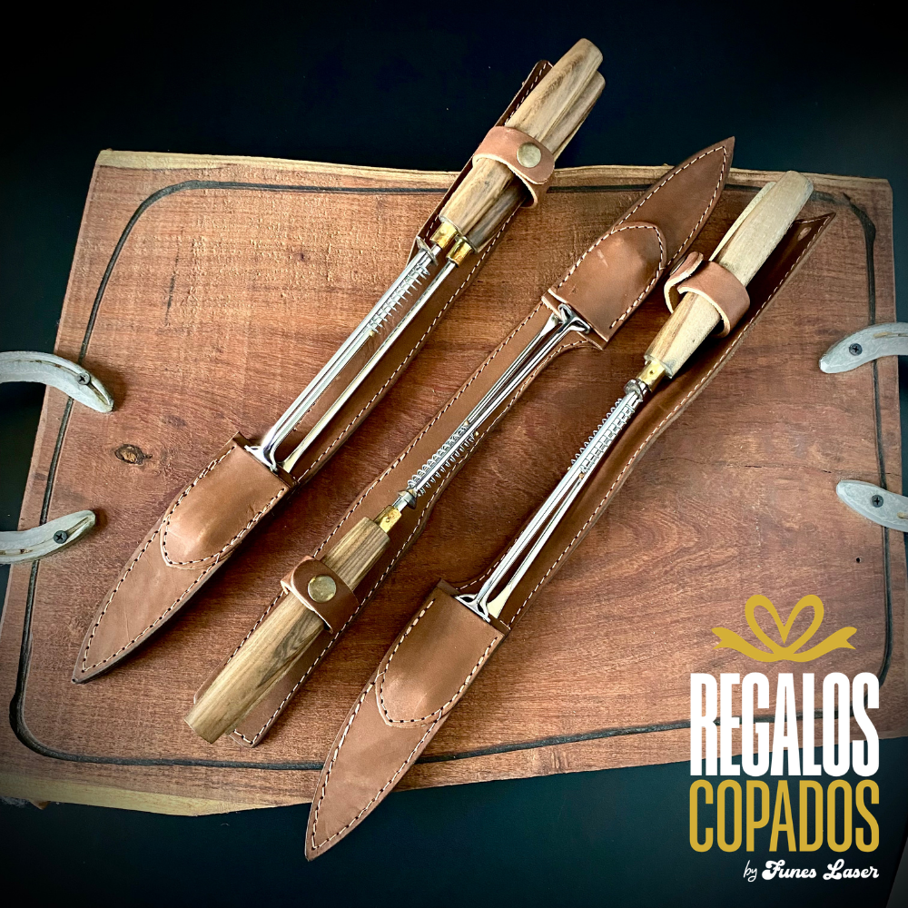 Juego parrillero Largo de cuchillo y tenedor expulsor artesanal de acero inoxidable personalizado con grabado láser de fibra óptica en una cara, no se borra, con vaina/estuche de cuero vacuno de regalo. (Uso exclusivamente culinario)