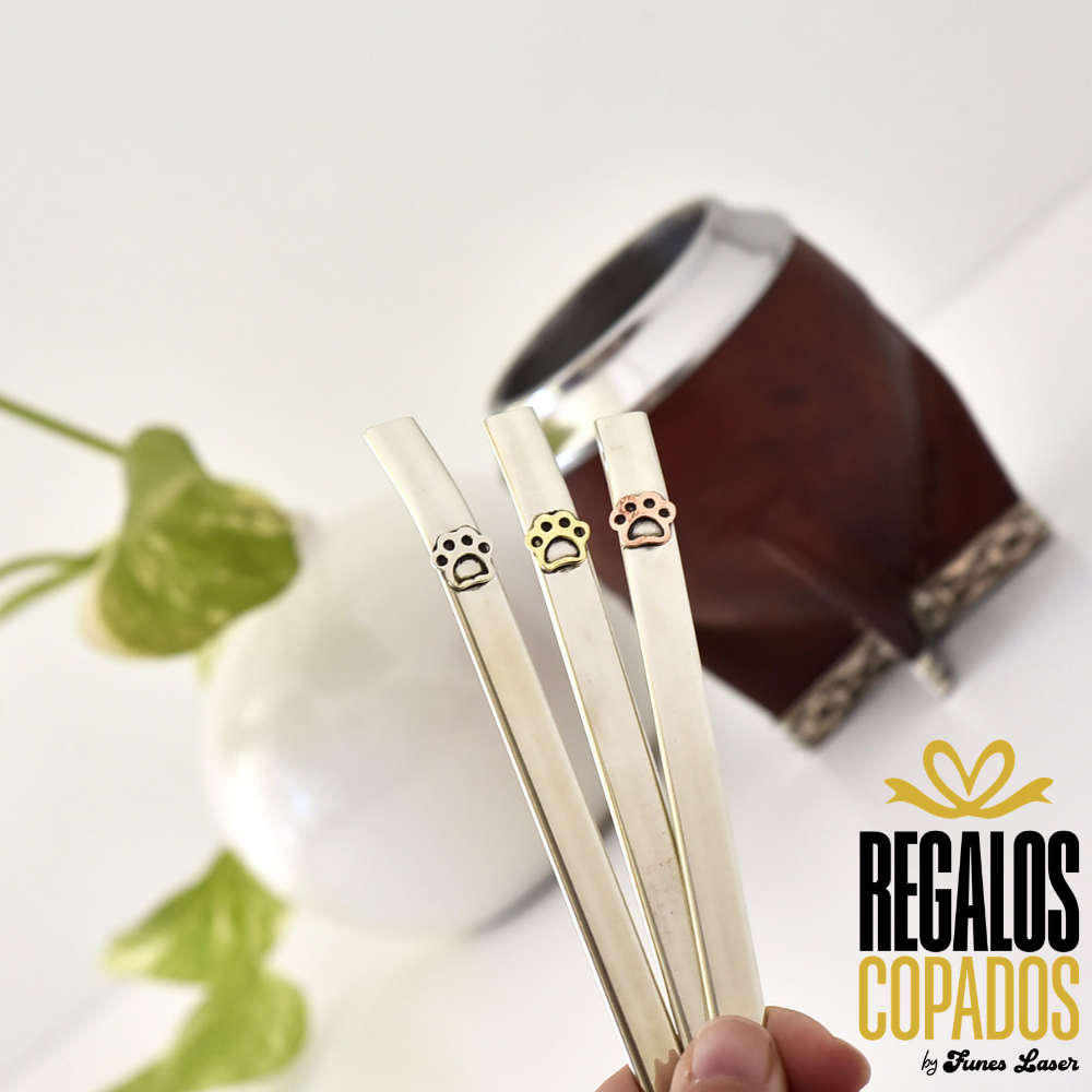 Bombilla artesanal plana con boca curva de alpaca, con aplique de gatito en bronce, alpaca y cobre.