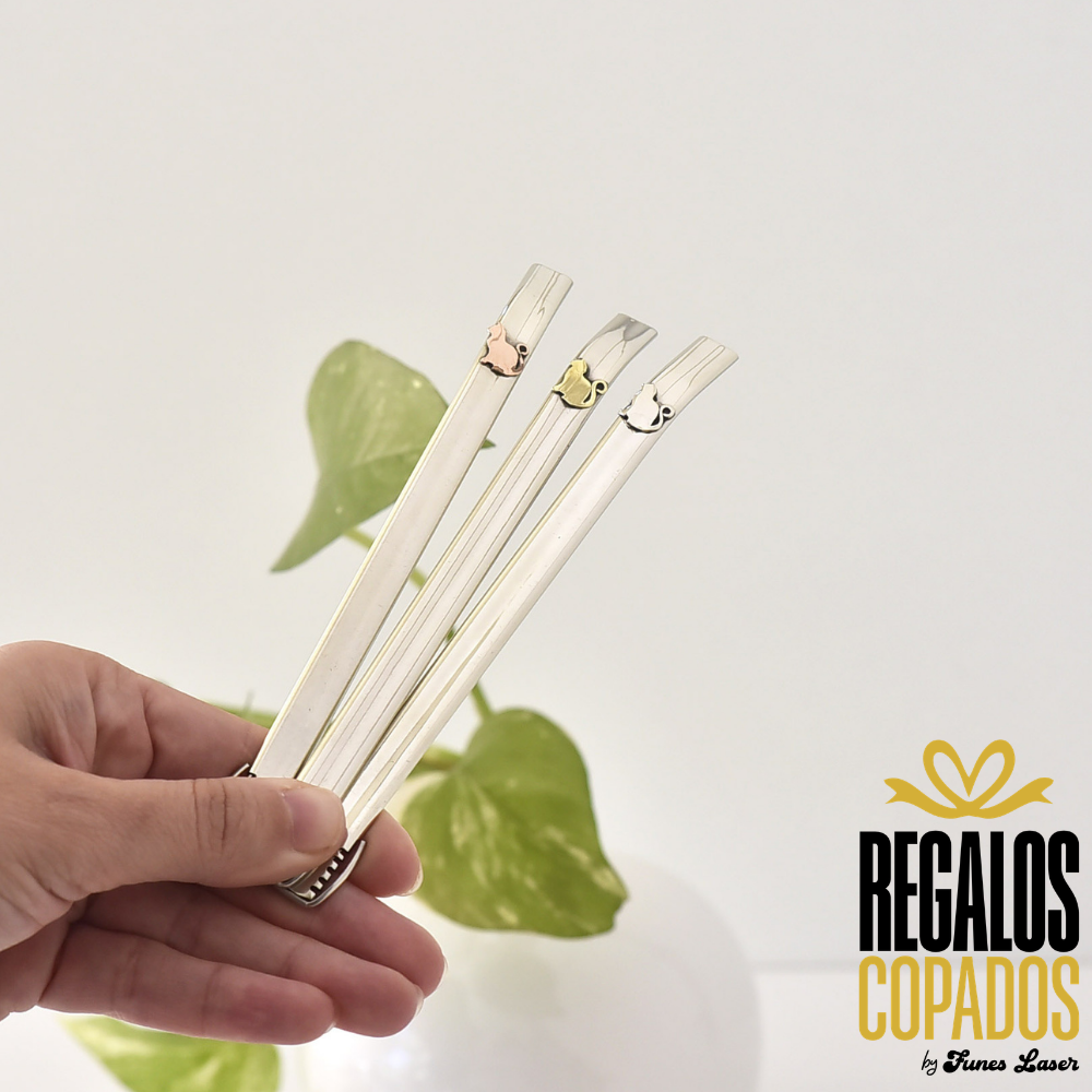 Bombilla artesanal plana con boca curva de alpaca, con aplique de gatito en bronce, alpaca y cobre.