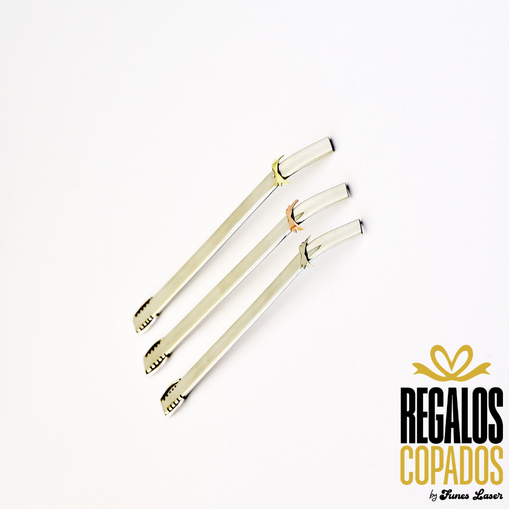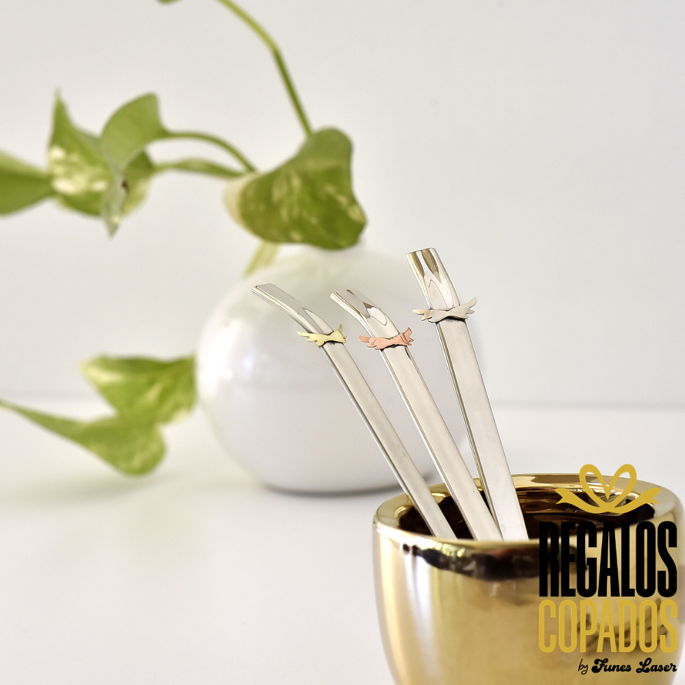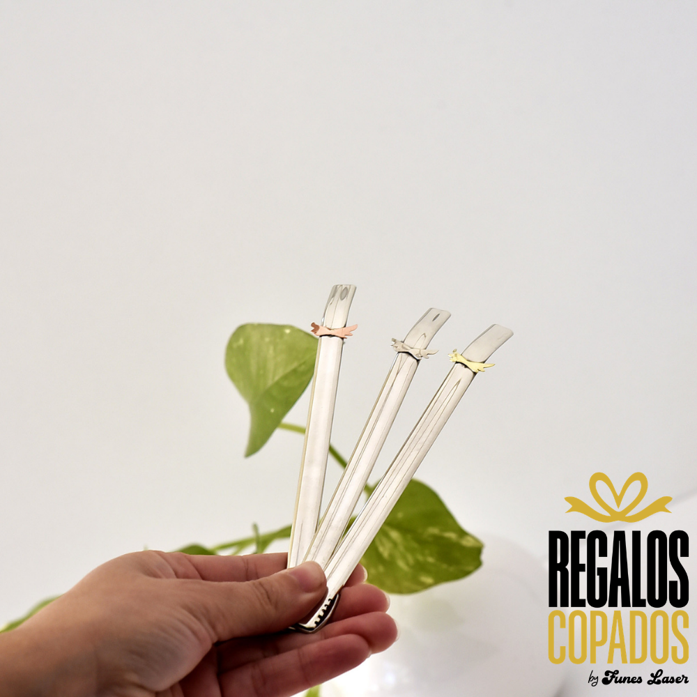 Bombilla artesanal plana con boca curva de alpaca, con aplique de alas en bronce, alpaca y cobre.
