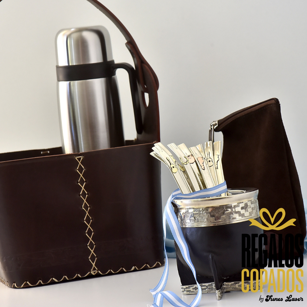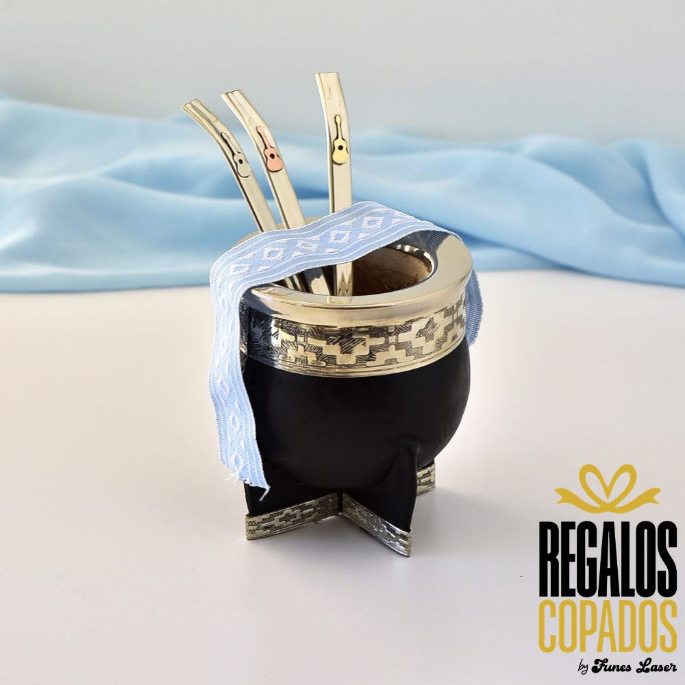 Bombilla artesanal plana con boca curva de alpaca, con aplique de guitarra en bronce, alpaca y cobre.