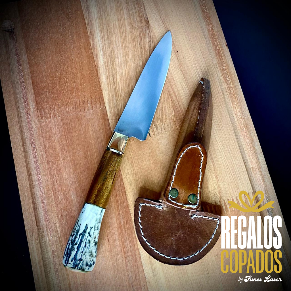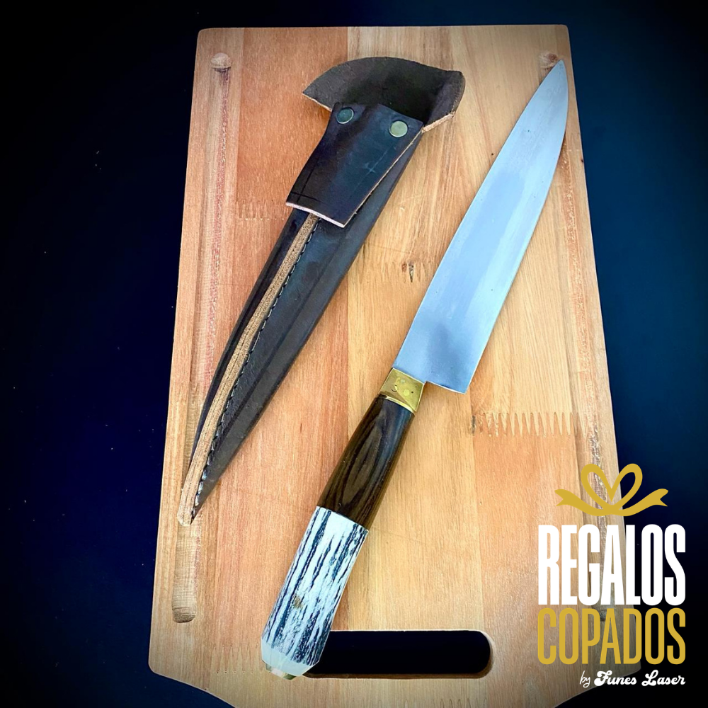 Campero artesanal, hoja de acero negro 1070 personalizado con grabado láser de fibra óptica en una cara, no se borra, con vaina de regalo. (Uso exclusivamente culinario)