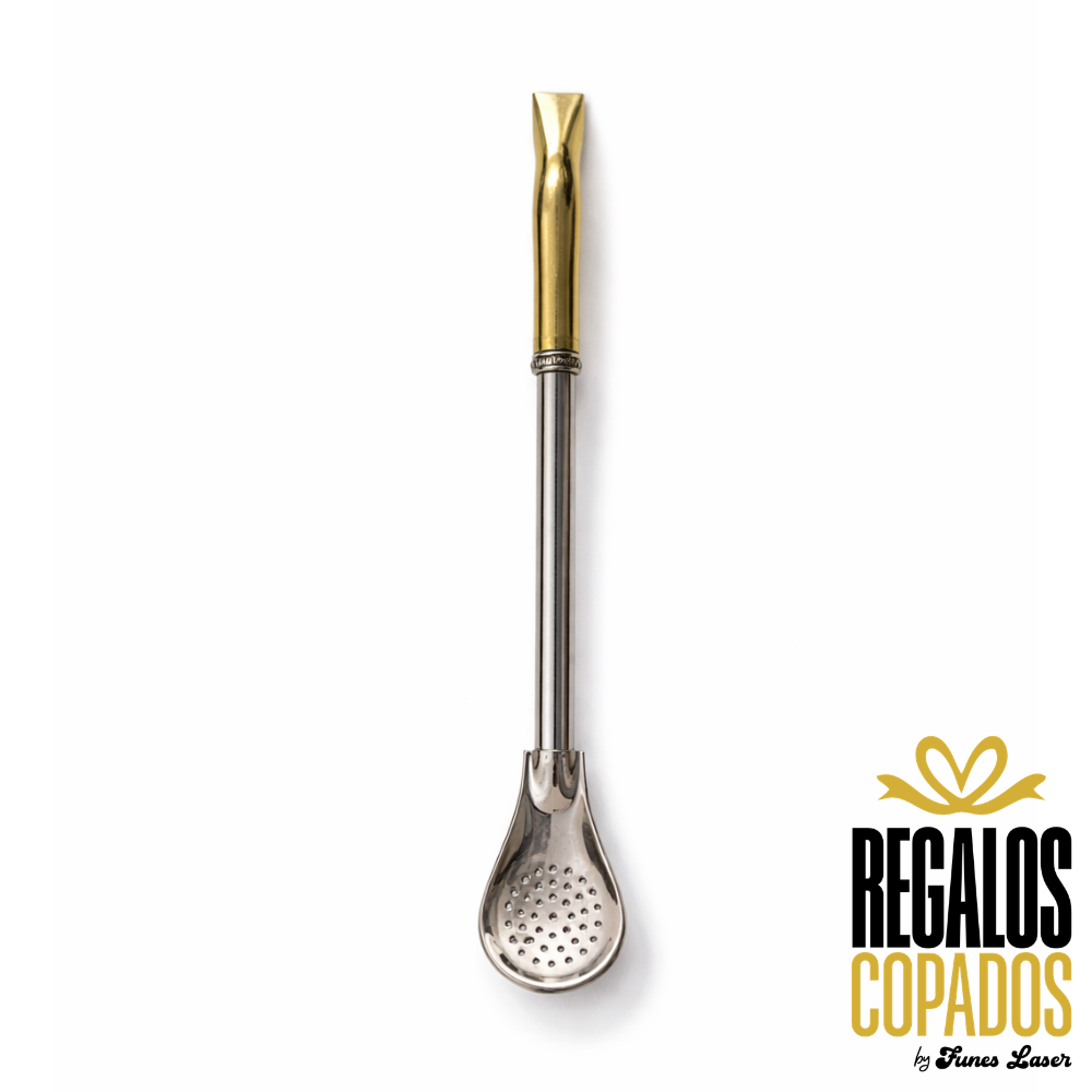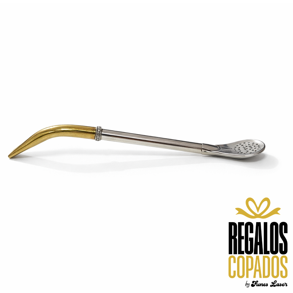 Bombilla de alpaca con pico dorado y virola de bronce , la misma aporta elegancia y estilo, permitiendo que el agua del mate ingrese de manera abundante al paladar.
