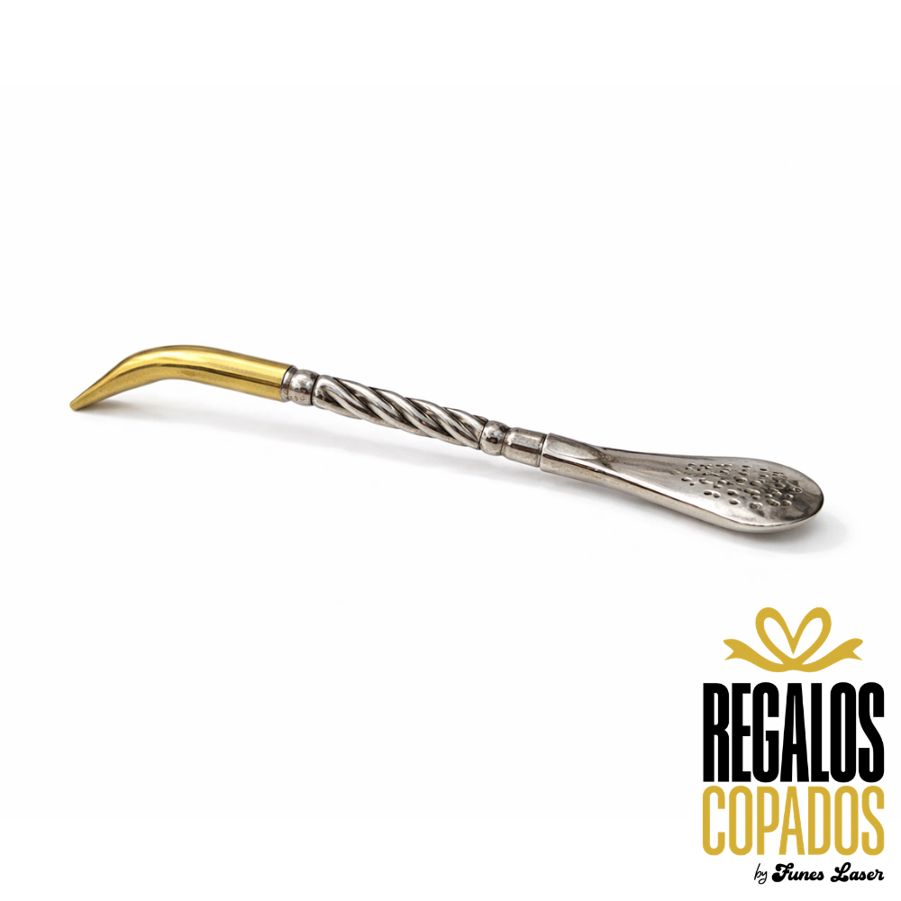 Bombillón Premium de alpaca con pico dorado y virola de bronce , la misma aporta elegancia y estilo, permitiendo que el agua del mate ingrese de manera abundante al paladar.