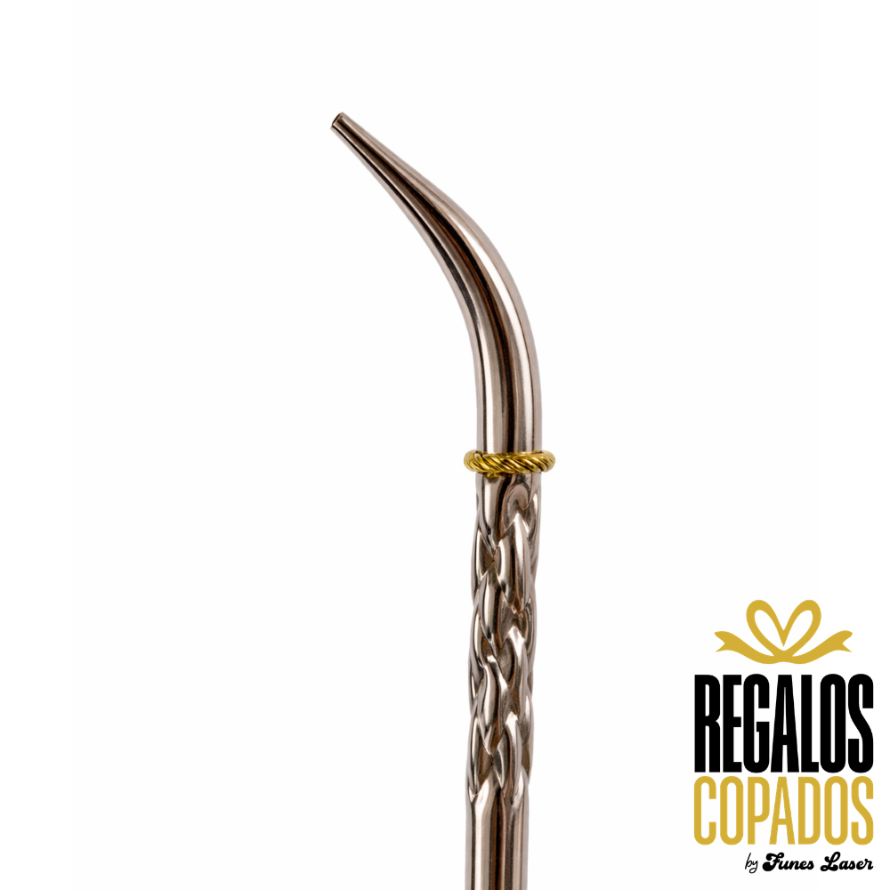 Bombillón Premium de alpaca con pico dorado y virola de bronce , la misma aporta elegancia y estilo, permitiendo que el agua del mate ingrese de manera abundante al paladar.