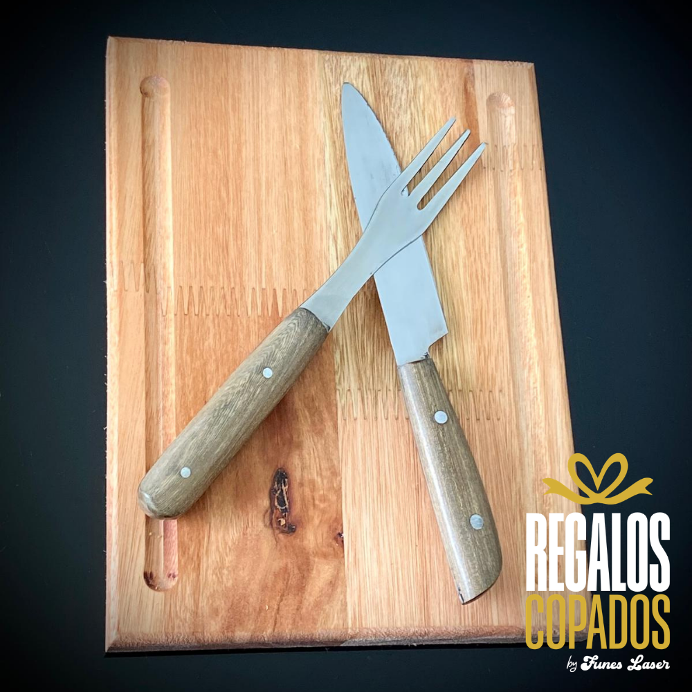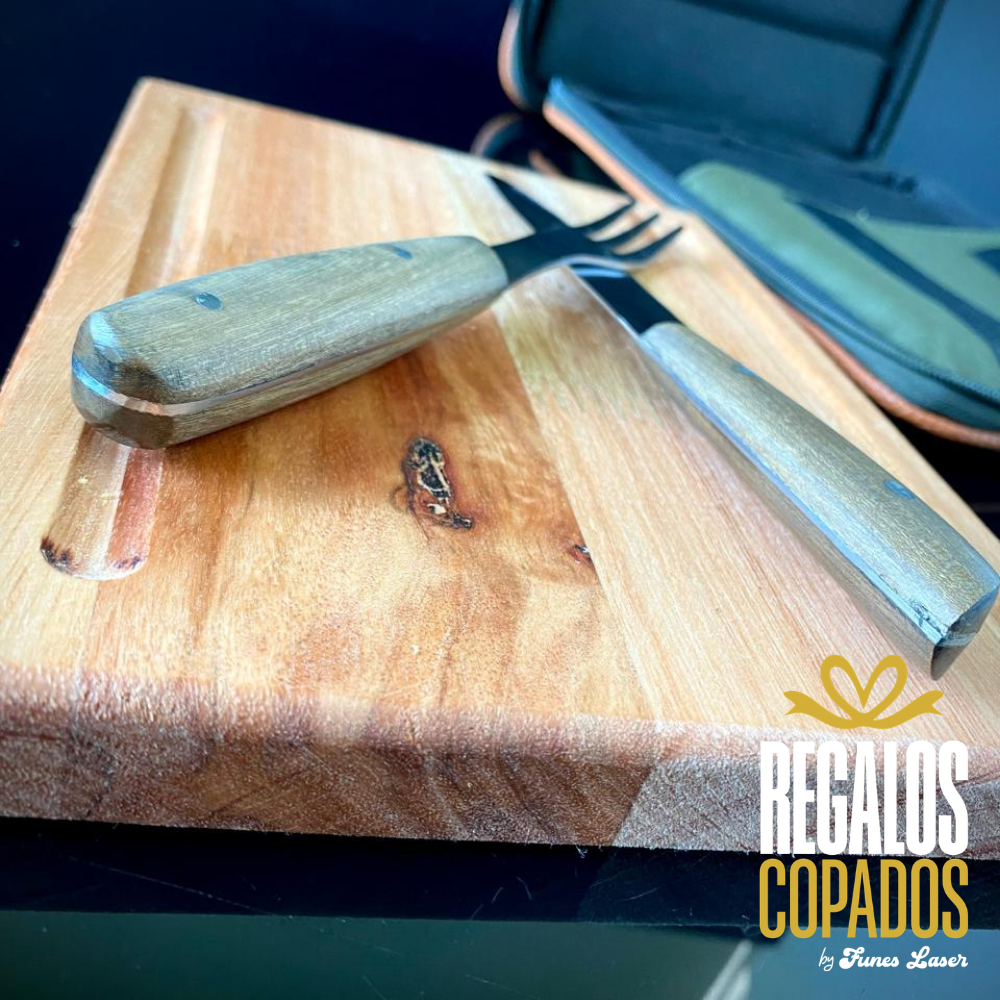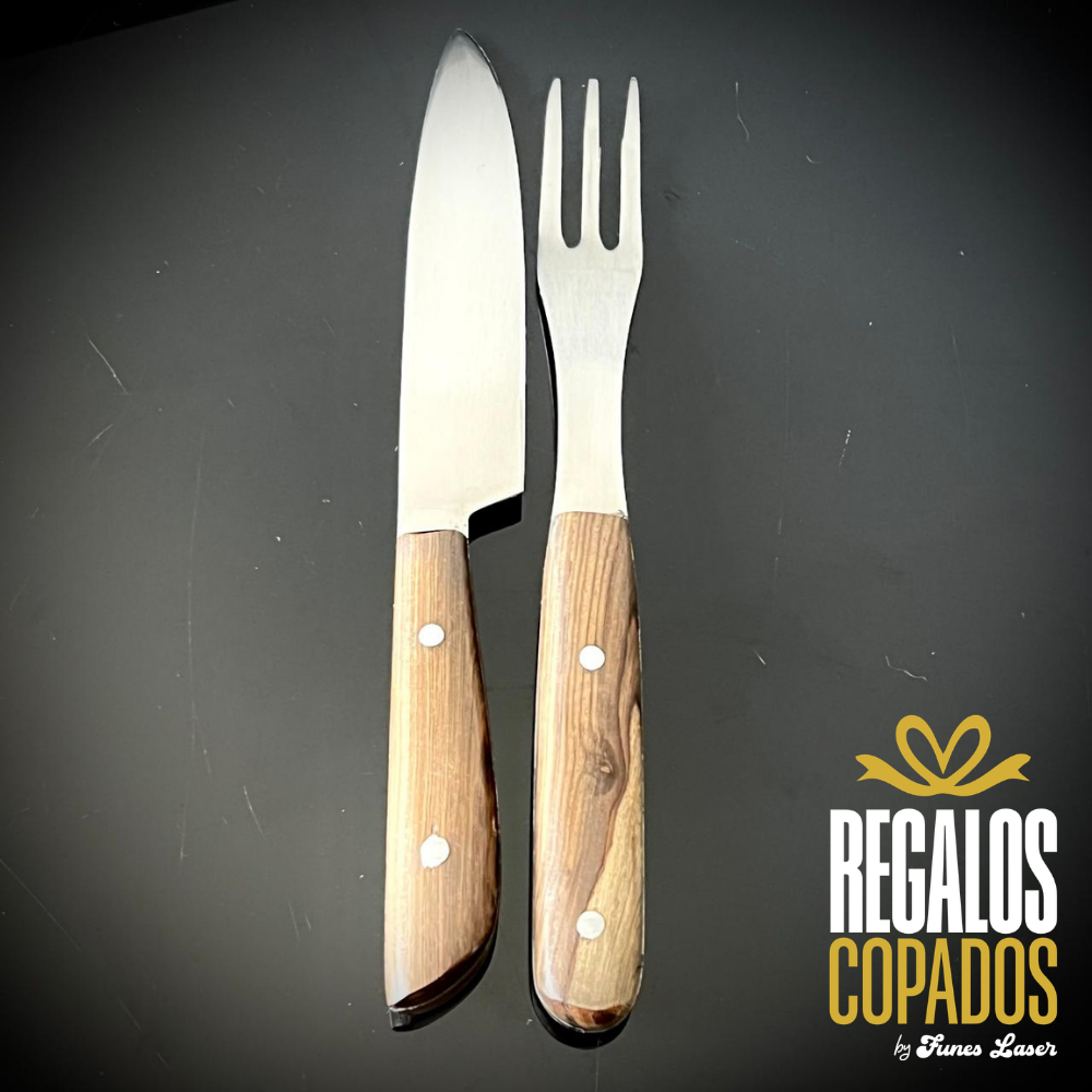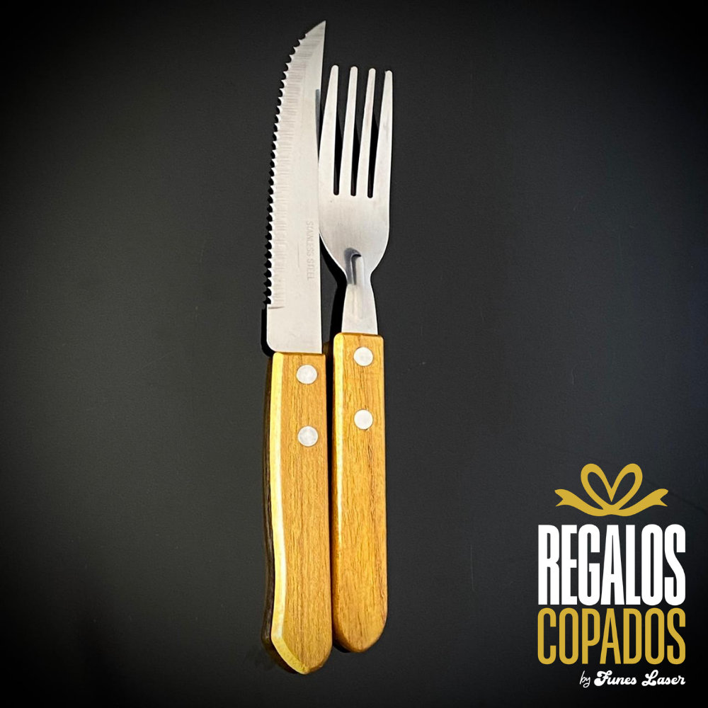 Juego cuchillo y tenedor de acero inoxidable personalizado con grabado láser de fibra óptica en una cara, no se borra. (Uso exclusivamente culinario)